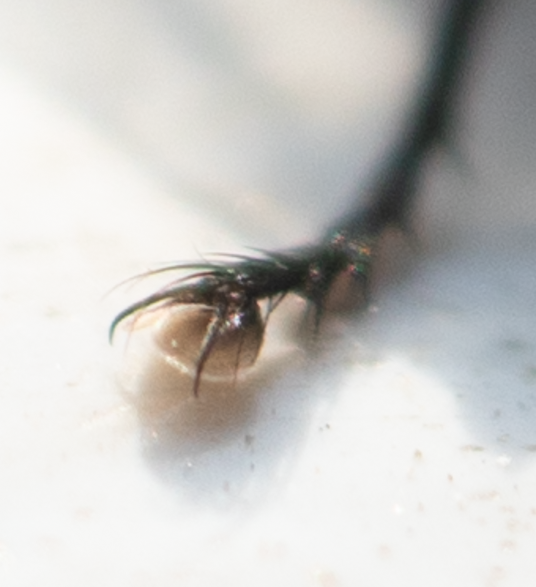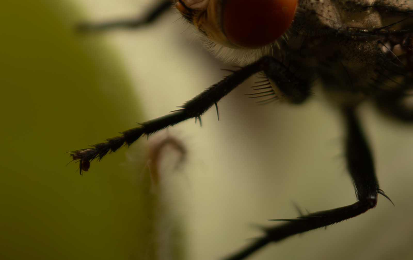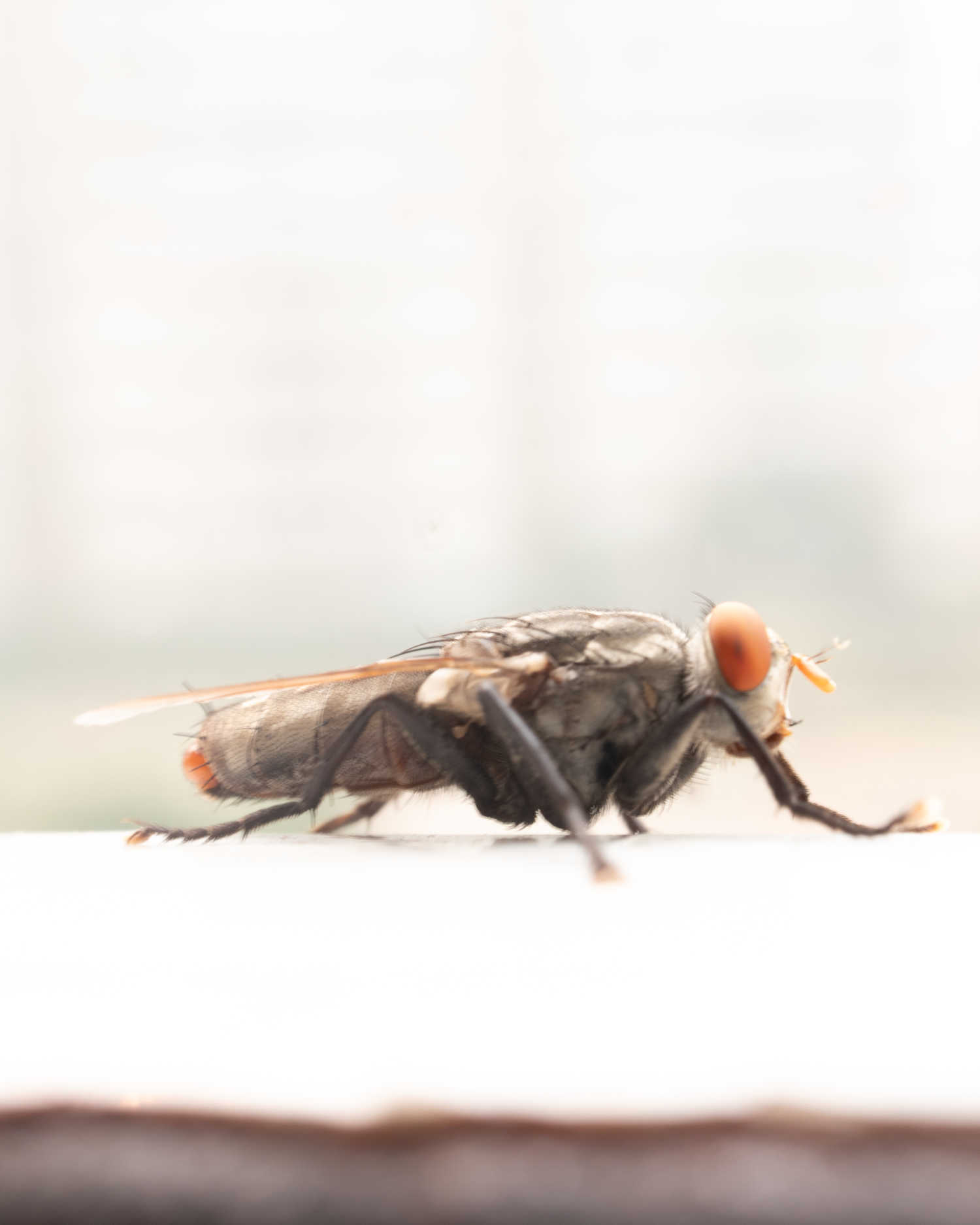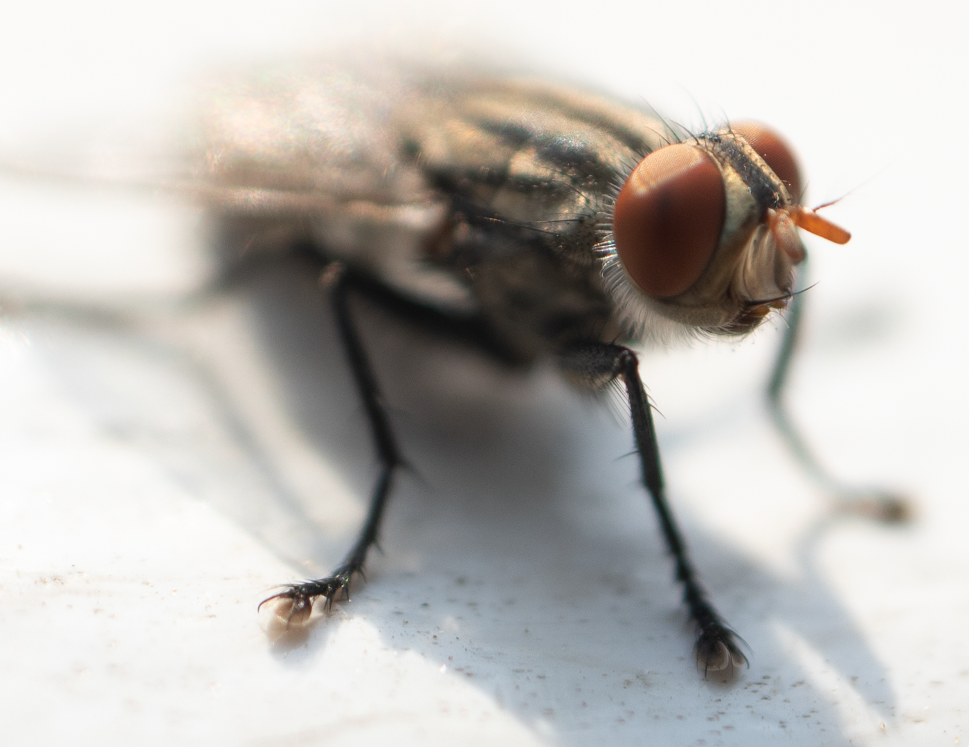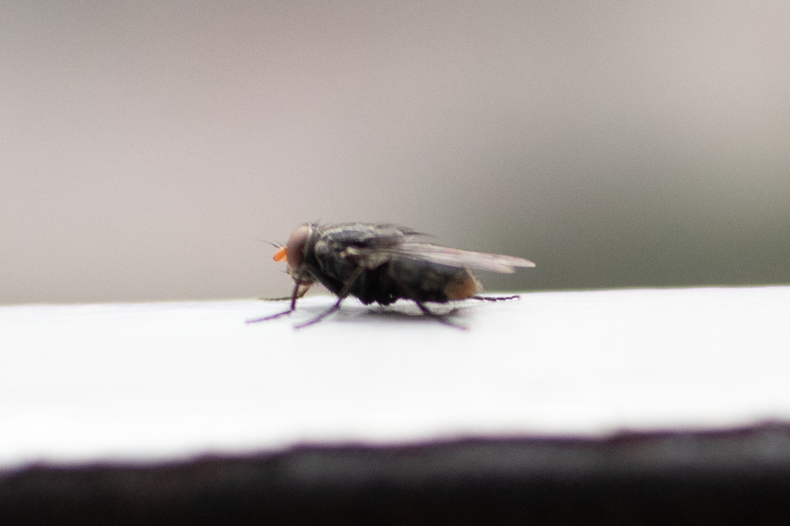 House flies’ abdomens are whole yellow to grey with more setae VS Flesh flies’ abdomens are grey, sometimes tipped red/orange/yellow/black with less setae
